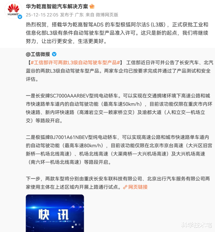 不过昨天晚上,华为官方确认,北汽极狐阿尔法S(L3版)采用的是华为ADS;华为官方还表示这只是新的起点,将继续努力,让出行更安全,生活更美好。